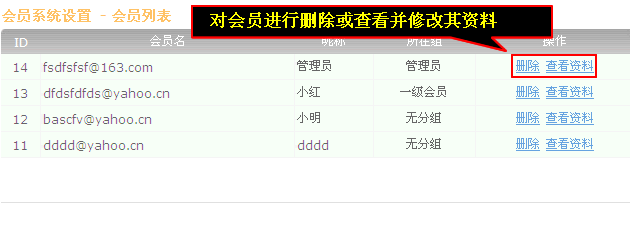 点击“删除”可以删除会员,点击“查看资料”可以对会员的资料进行修改及密码修改。